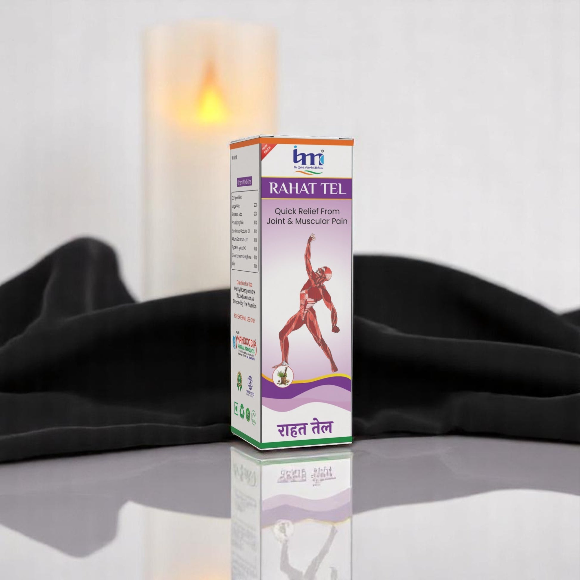 IMC Herbal Rahat Tel Natural Herbal Oil for Quick Relief from Joint & Muscle Pain IMC Herbal Rahat Tel is a traditional Unani herbal massage oil specially formulated to relieve joint pain, muscle aches, swelling, and stiffness naturally. It penetrates deep into the affected area, improves blood circulation, and provides fast, soothing comfort without harmful chemicals. ________________________________________ Key Benefits: • Helps reduce pain, swelling, and inflammation in joints and muscles. • Provides quick relief from back pain, knee pain, and body aches. • Useful for arthritis, sprains, and muscle stiffness. • Improves flexibility and supports healthy joint movement. • 100% herbal, safe for external use, and non-greasy. ________________________________________ Main Ingredients: • Gandhpura Oil (Wintergreen) – A natural pain reliever for joints and muscles. • Camphor & Menthol – Provide cooling relief and relax sore muscles. • Other Herbal Oils – Support blood circulation and long-lasting comfort naturally. ________________________________________ How to Use: 1. Apply Rahat Tel to the affected area. 2. Massage gently for 5–10 minutes until absorbed. 3. Use 2–3 times daily or as advised by your physician. (For external use only) ________________________________________ Why Choose IMC Herbal Rahat Tel? ✔ 100% herbal and chemical-free formula. ✔ Fast-acting and safe for regular use. ✔ Non-sticky and absorbs quickly. ✔ Trusted IMC Herbal quality for natural pain relief. ________________________________________ ✅ Pack Size: 50ml / 100ml / 200ml ✅ For quick, natural relief from joint pain, muscle aches, and stiffness.